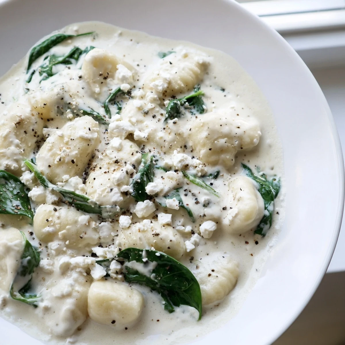Soft potato dumplings swim in a velvety cream sauce, mingling with wilted fresh spinach and crumbling salty feta throughout. This dish comes together quickly—boil the gnocchi until they float, sauté onion and garlic until fragrant, then build the sauce by simmering heavy cream with vegetable broth. The feta melts partially into the cream, creating pockets of tangy richness while Parmesan adds depth. A pinch of nutmeg enhances the sauce's warmth, though it remains optional.